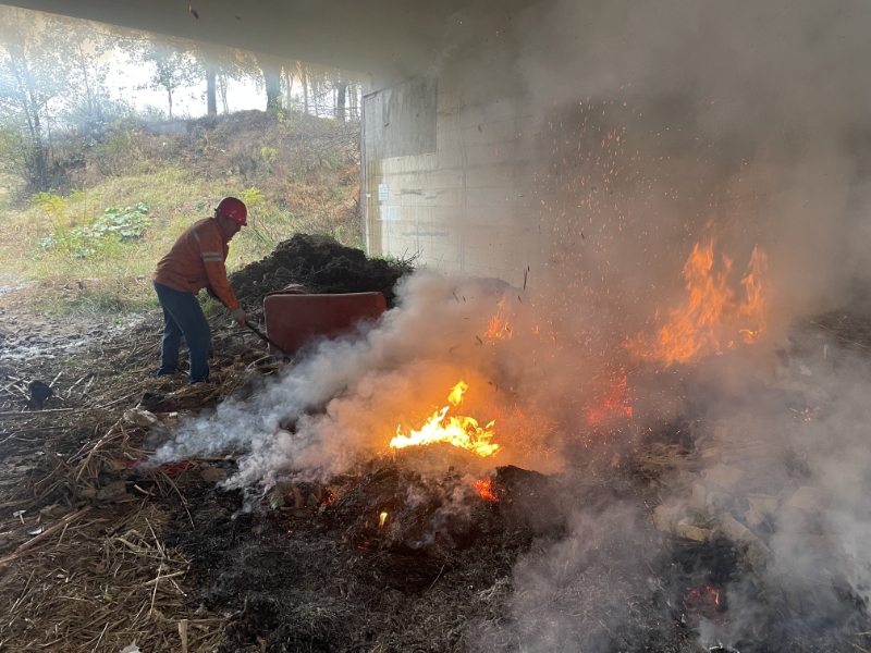 10月9日上午10时18分,宣化养护队值班人员接到宣化保通保畅大队紧急电话,告知大同方向K176+255桥下突发火情,需立即前往灭火。值班人员第一时间上报养护队负责人,队领导迅速统筹部署,明确任务分工与处置流程。10时29分,队长和值班人员携带沙子、灭火器、铁锹等应急物资抵达现场。经现场勘查,为桥下杂草被引燃已形成多处明火,若不及时控制,将严重影响道路正常通行。