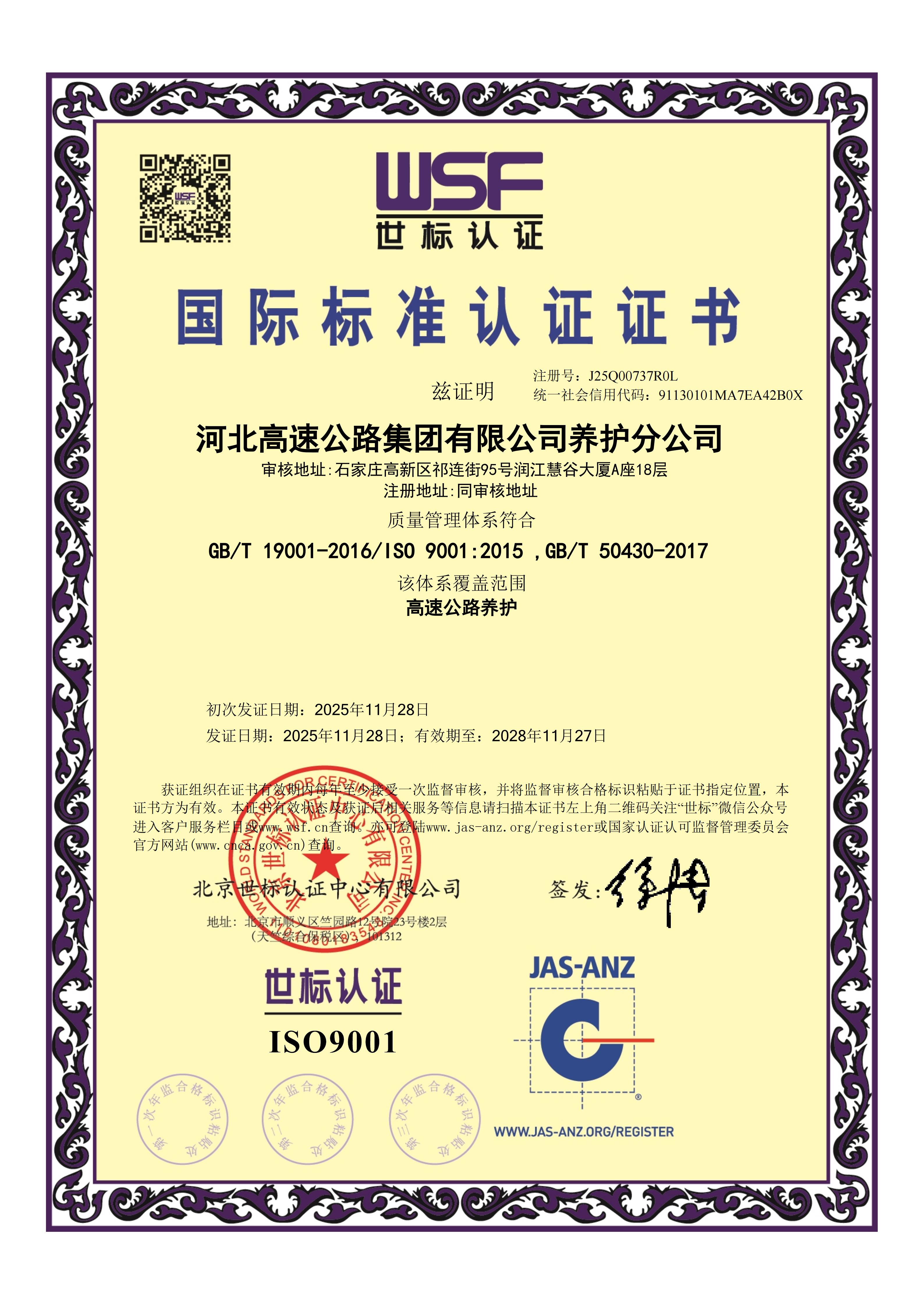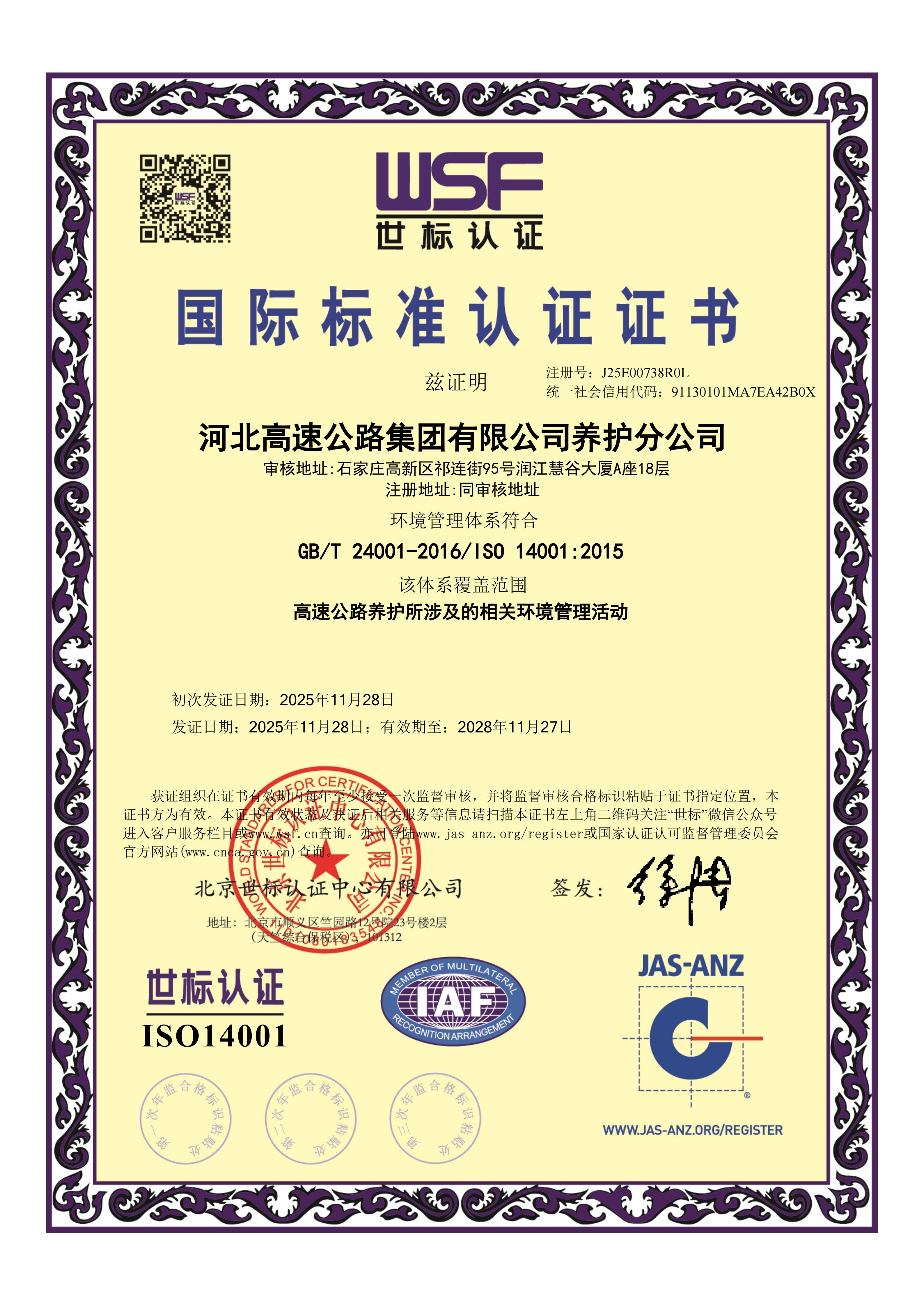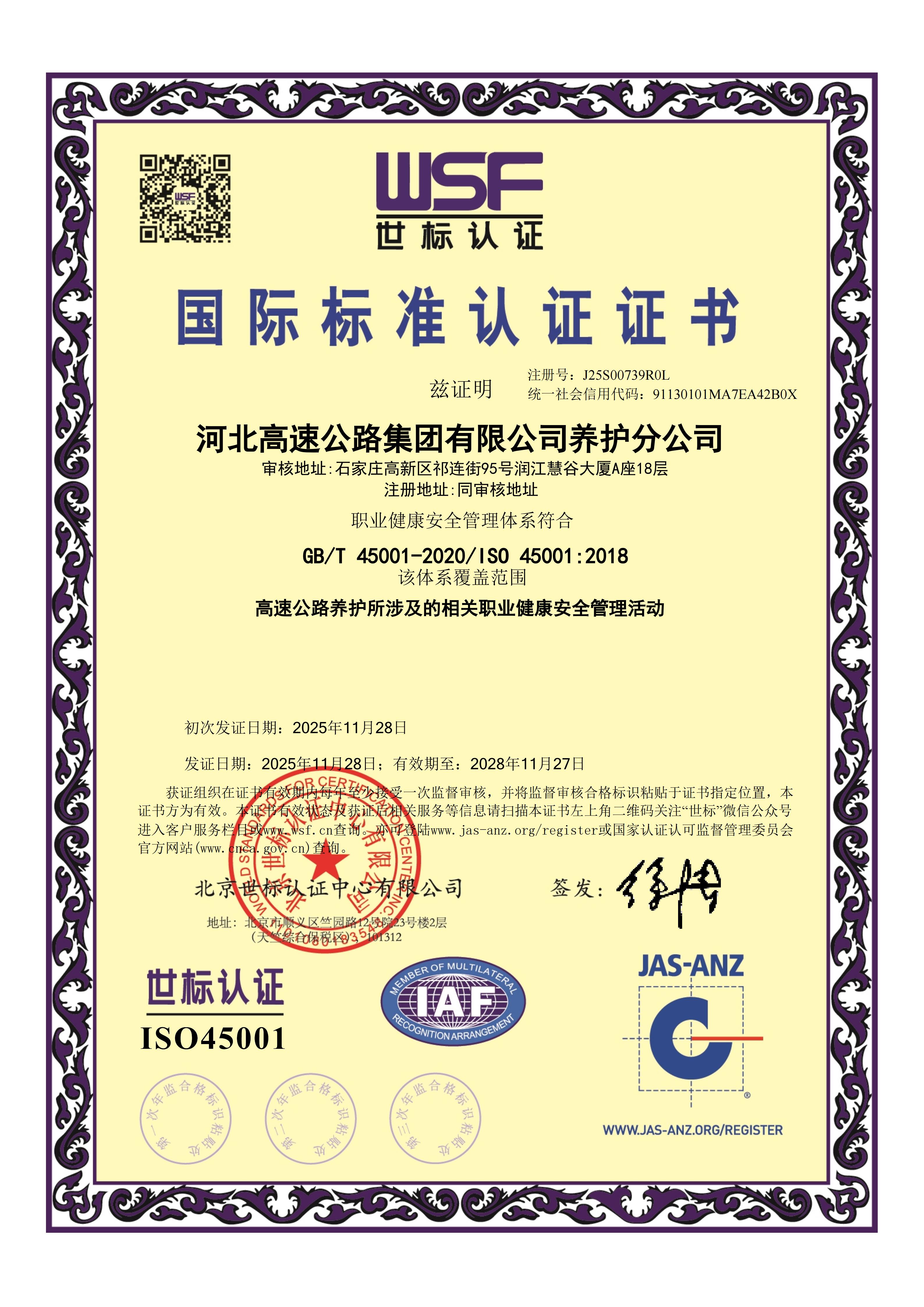 2025年11月28日,河北高速公路集团有限公司养护分公司成功通过质量、环境、职业健康安全管理体系认证审核,正式取得认证证书。这标志着养护分公司在标准化、规范化管理领域迈出关键一步,为高质量发展奠定了坚实的管理基础。