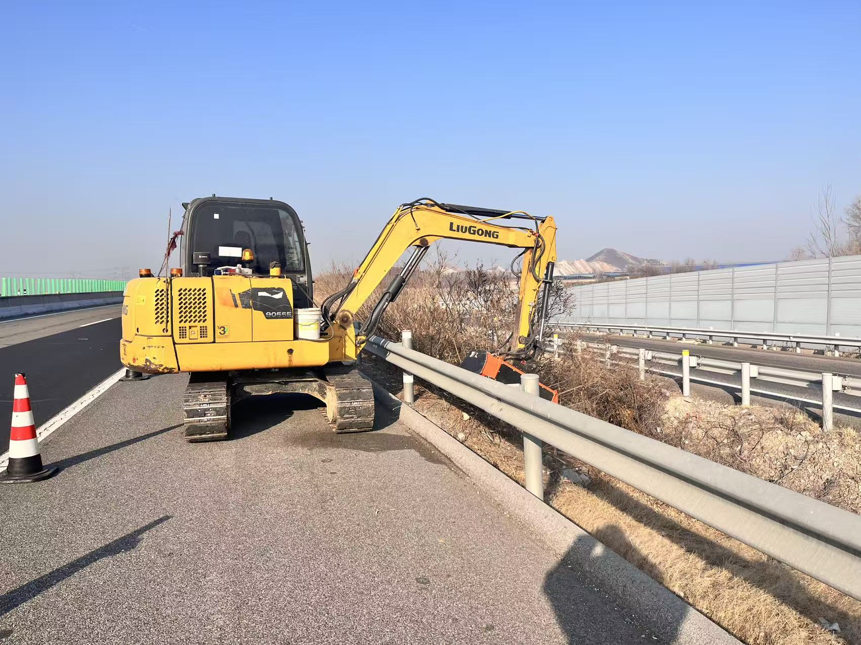 燕郊养护队外业组主动担当、科学统筹,将紫穗槐清除与冬季除雪保畅准备工作同部署、同推进、同落实,全方位织密年终岁尾安全防护网。在紫穗槐清除工作中,与辖区路段的高速交警、路政等部门沟通协调,在多方密切配合下,制定精细化施工方案。因作业需占用应急车道,养护队外业组始终将安全管控贯穿全程,提前精准划定作业范围,排查边坡地质条件与交通流量特点,明确“机械为主、人工为辅”的作业模式,配备车载式粉碎刀头等专业设备,合理规划施工时段;作业前沿线设置醒目安全警示标识与防护围挡,安排专人提前疏导交通,现场配置安全导改队伍,明确应急处置流程,保障施工期间道路通行有序,避免作业期间引发安全事故;养护外业组克服边坡坡度大、互通区域作业空间狭窄等困难,机械负责主线大面积清除,人工精准处理机械无法触及的拐角、标识牌周边区域,同步清理杂物,实现“清除一处、整洁一处”,切实提升道路通行安全系数。