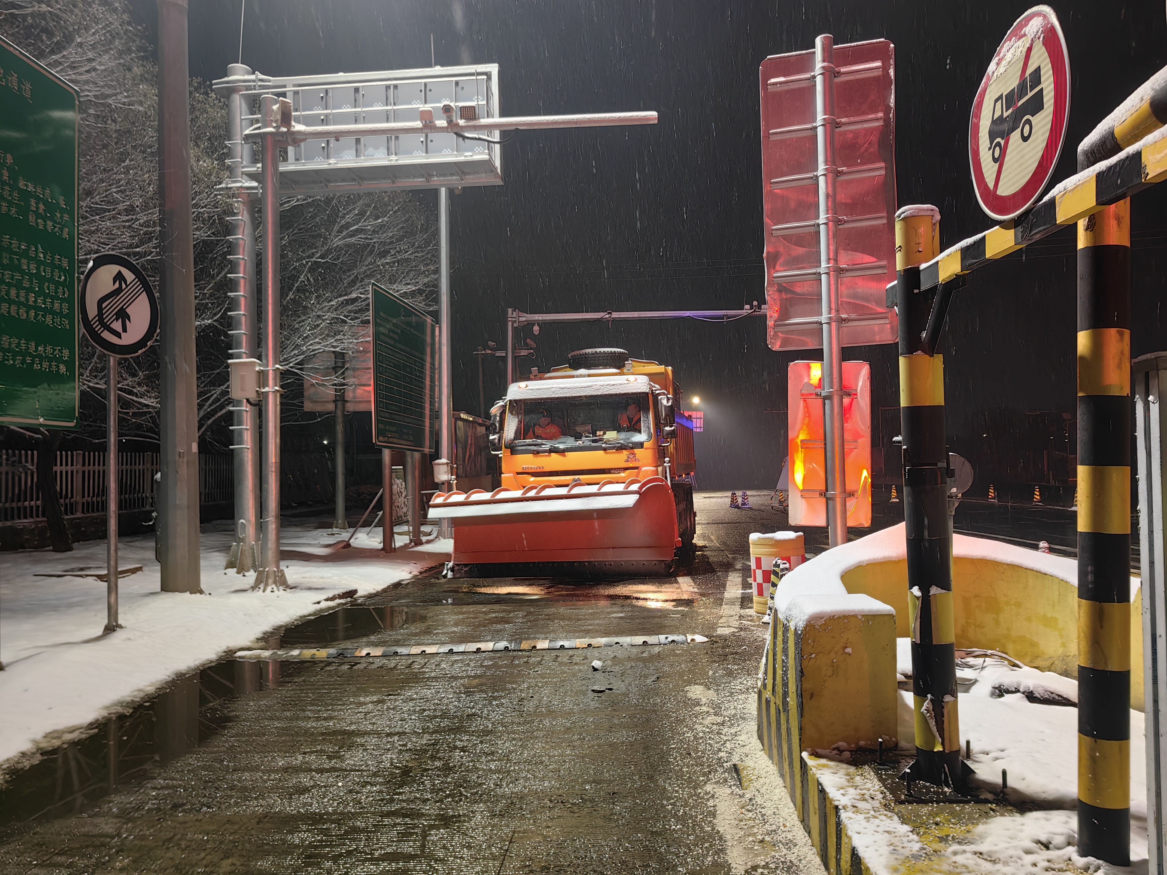 降雪伊始,养护队按照既定方案迅速投入除雪战斗。大型撒布车、液态融雪剂洒布车依次出发,作业人员顶风冒雪、不畏严寒,沿着绕行路线穿梭在养护路段上,对主路、收费站匝道等关键区域开展不间断融雪剂撒布和液态融雪剂喷洒作业。在持续17个小时的高强度作业中,队员们克服了绕行路程远、作业环境复杂、夜间低温严寒等多重困难,始终坚守在除雪一线,以“雪不停、人不歇”的担当精神全力奋战。