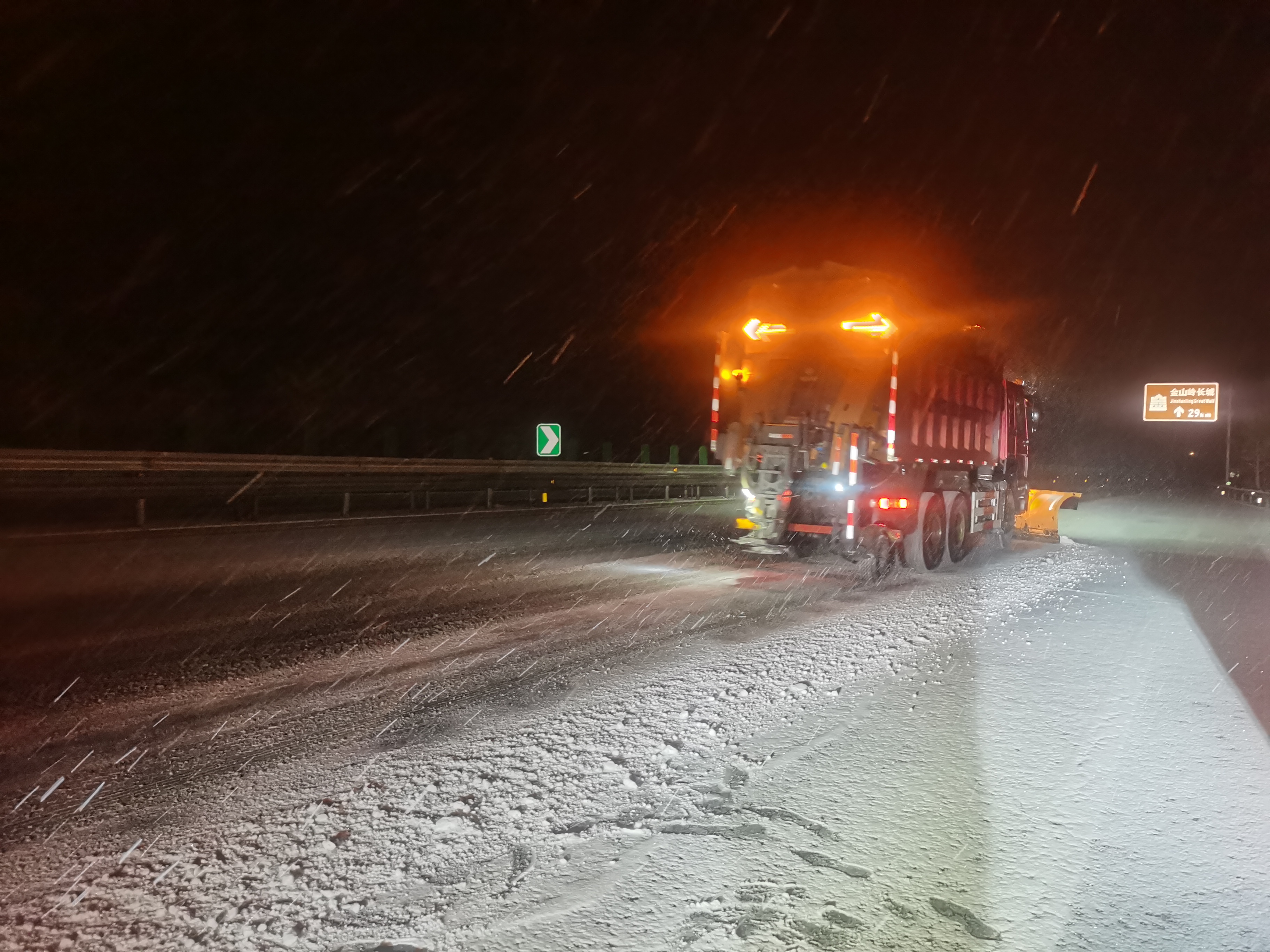 由于中雪持续时间长,加上凌晨气温低至零下10摄氏度,刚清理过的路面极易再次结冰,这对养护人员来说,是不小的考验。除雪车队保持不间断作业节奏,撒布车与铲雪车协同配合、循环作业,增加融雪剂撒布频次,强化防冰效果。同时,针对匝道、背阴处等重点部位采用人工定点撒布,确保积雪无残留、无死角。