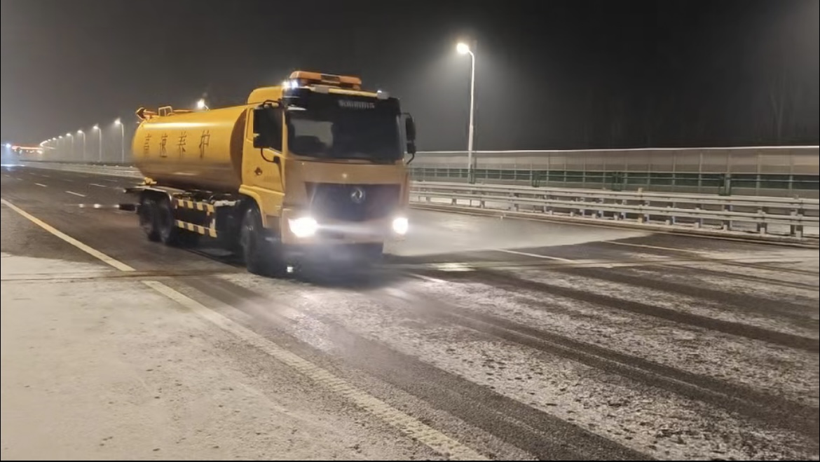 在严寒的深夜,固安养护队争分夺秒,调集精锐力量与专业设备投入战斗。现场共出动除雪车3台、盐水洒布车2台、装载机2台及辅助作业皮卡车2台,组成高效的除雪作业编队。作业人员不畏低温,按照“先主线、后重点”的作业原则,采取机械除雪与预防性撒布融雪剂相结合的方式,对高速路面特别是桥梁、坡道、弯道等关键部位进行循环清雪与防结冰处理。
