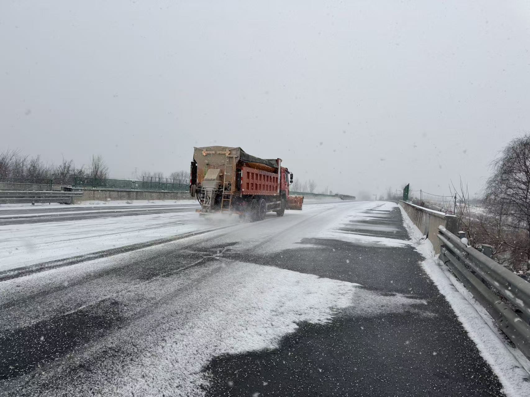 1月17日7时起,涞水县遭遇大范围降雪,气温骤降导致京昆高速辖区路段快速积雪,桥梁区域出现薄冰,严重影响司乘出行安全。张家口分中心涞水西养护队闻雪即动,迅速启动除雪保畅应急预案,联动高速交警、保通保畅大队形成工作合力,高效开展除雪作业。