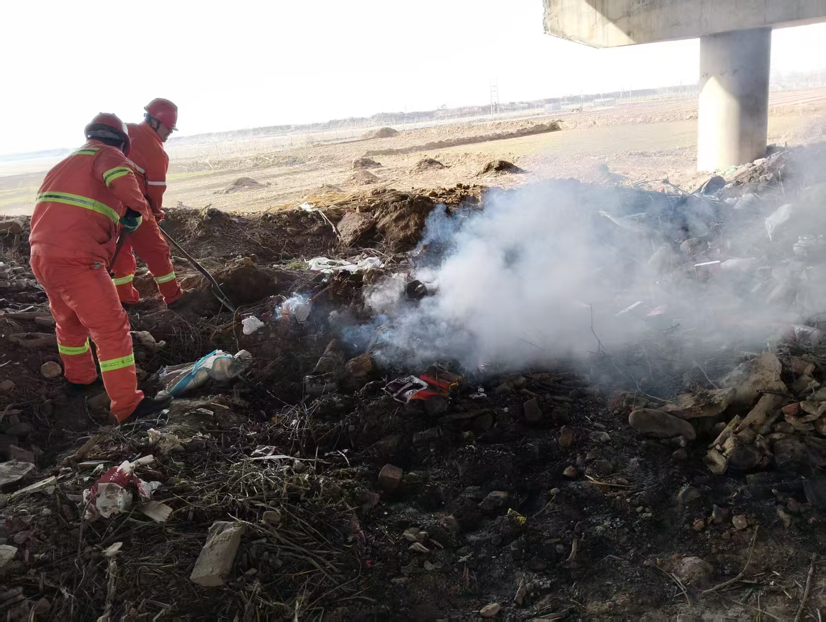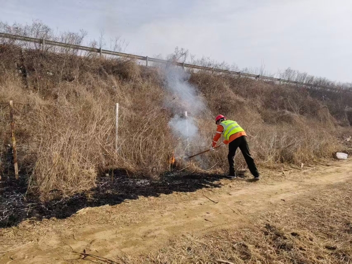 险情就是命令,责任就是使命。涞水北养护队第一时间启动应急处置流程,迅速组织巡逻人员赶赴事发现场。初春时节气候干燥,桥下及边坡枯草密布,火势已出现扩散迹象,处置刻不容缓。养护队员沉着应对,利用随车铁锨等工具快速扑打明火,果断隔离燃烧区域与未燃枯草,切断火势蔓延途径。明火被彻底扑灭后,工作人员持续铲土覆盖冒烟点位,严防死灰复燃,经过30分钟紧张高效的连续作业,现场明火、烟点全部消除。作业人员对现场进行全面细致排查,确认无复燃隐患后,方才有序撤离。