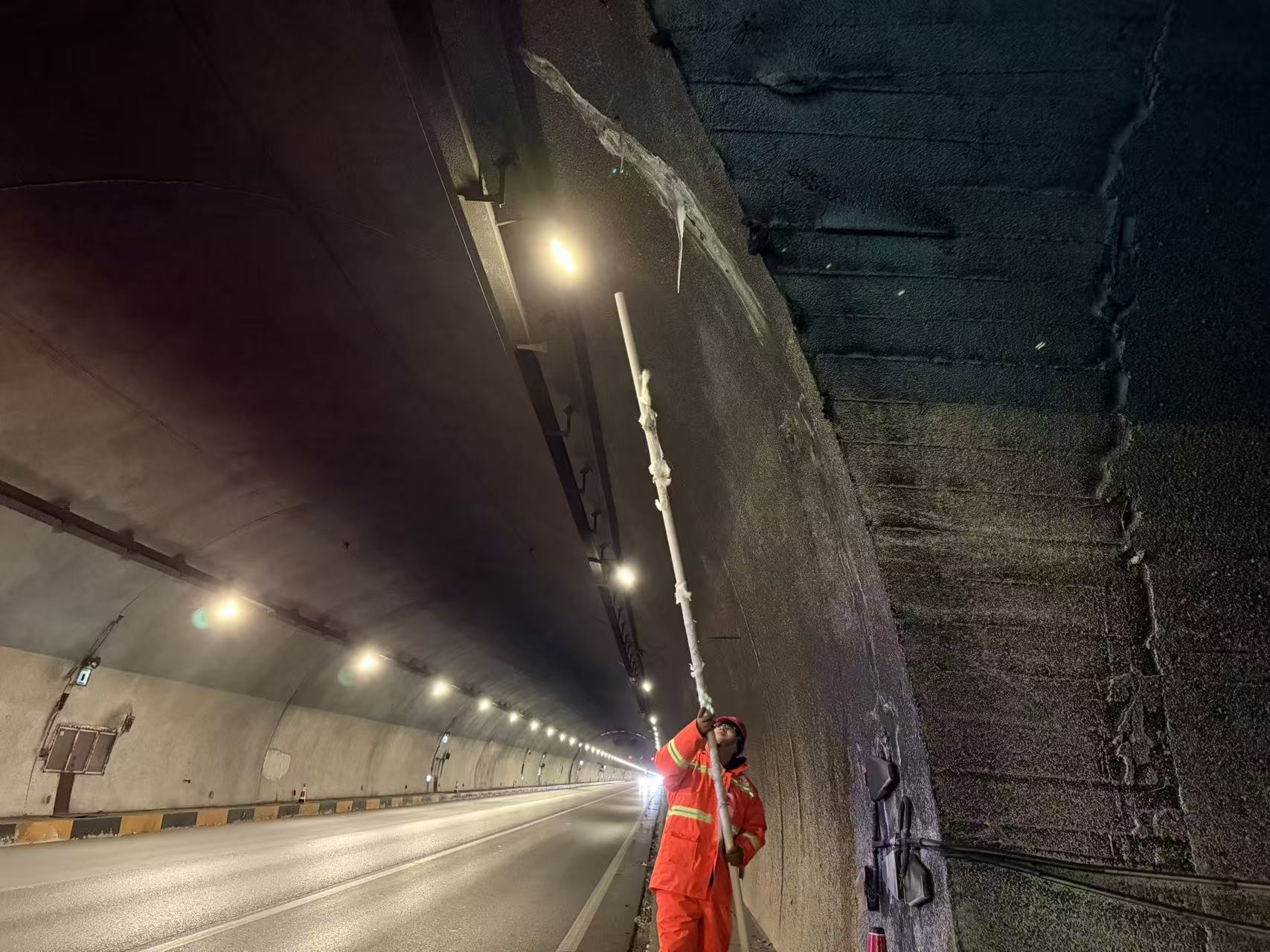 受低温影响,营尔岭隧道等多处出现侧墙结冰现象。涞源养护队第一时间启动低温应急响应机制,组织养护队人员对隧道冰挂进行清理,快速消除安全隐患。同时,在隧道入口设置警示标志,提醒驾驶员减速慢行,确保行车安全。