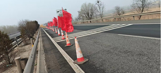作业现场,养护队严格落实施工现场安全管理要求,在作业区域前后设置警示标志,沿来车方向摆放反光锥桶、警示旗帜,划定封闭作业区域,安排专人在作业区域边缘引导过往车辆减速避让,实现施工区域与通行区域的安全隔离。