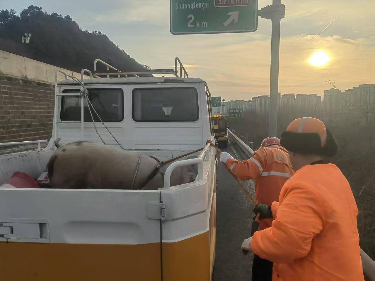 双峰寺养护队接到通知后,立即启动应急处置预案,第一时间赶往现场。在高速交警的协助下,迅速在现场设置安全警示标志,引导过往车辆减速避让,避免引发交通事故。面对受惊挣扎、四处乱窜的生猪,养护队员沉着冷静、分工协作,一边小心翼翼稳住生猪“情绪”,一边利用绳索、防护工具对其稳妥控制。经过数分钟紧张处置,成功将这头“越狱”的生猪转移至安全区域,之后将生猪赶回车上并帮助车主检查、加固车厢围栏,避免再次发生货物掉落险情。在确认路面无安全隐患、道路恢复正常通行后,养护队员这才放心离开现场。