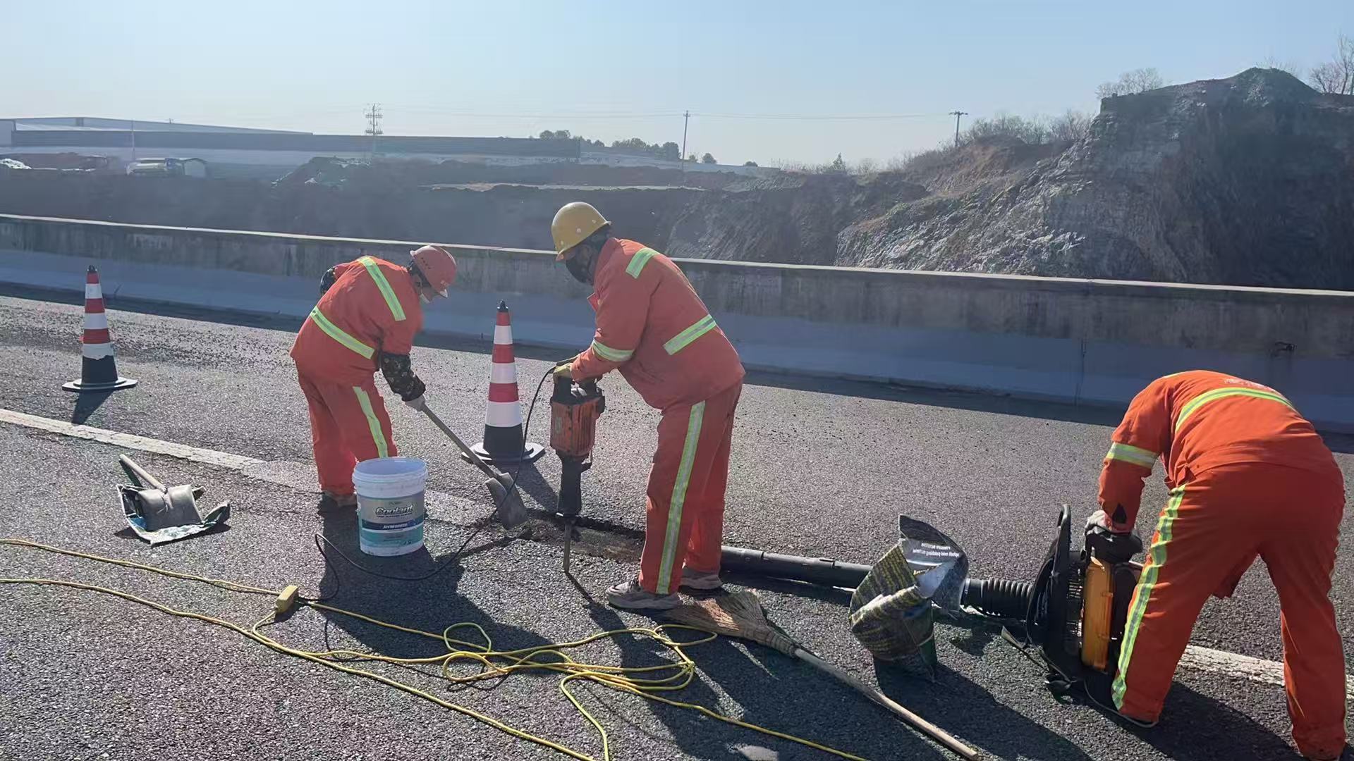 本次共处置两处路段合计9个坑槽,其中蒋福山出口匝道桥(K57+400)处处置桥面连续坑槽8处,K60+435路段处置坑槽1处。外业组全员分工协作、高效联动,严格执行每一道施工工序,从早上7点开始至上午10:45,便高效完成标志摆放、安全导改及全部坑槽修补作业,真正实现快速处置、快速修复、快速通车,及时消除路面安全隐患,有力提升道路通行质量。