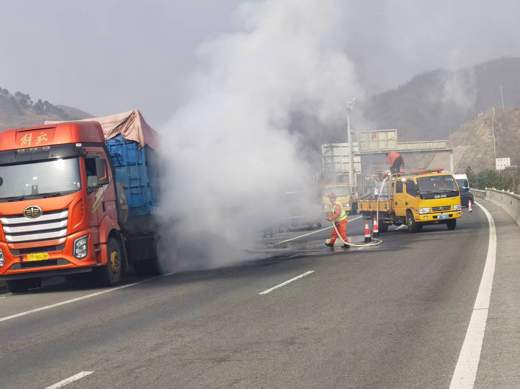9点30分到达事故现场,坡仓养护队立即启动特勤处置预案,兵分两路,一队在交通临时管控的情况下进行安全警戒部署,开启爆闪灯、鸣响警报器,用醒目的警示信号提醒后方车辆,在火情周边筑起一道“安全屏障”,防止二次事故发生。另一个队伍由徐克平带领迅速奔向起火货车,手持灭火水枪展开扑救,面对窜动的火苗和刺鼻的烟味,大家分工协作,动作熟练,循着日常演练的操作流程,精准对准起火点压制火势。随着火苗逐渐变小、熄灭,现场所有人悬着的心终于落地。