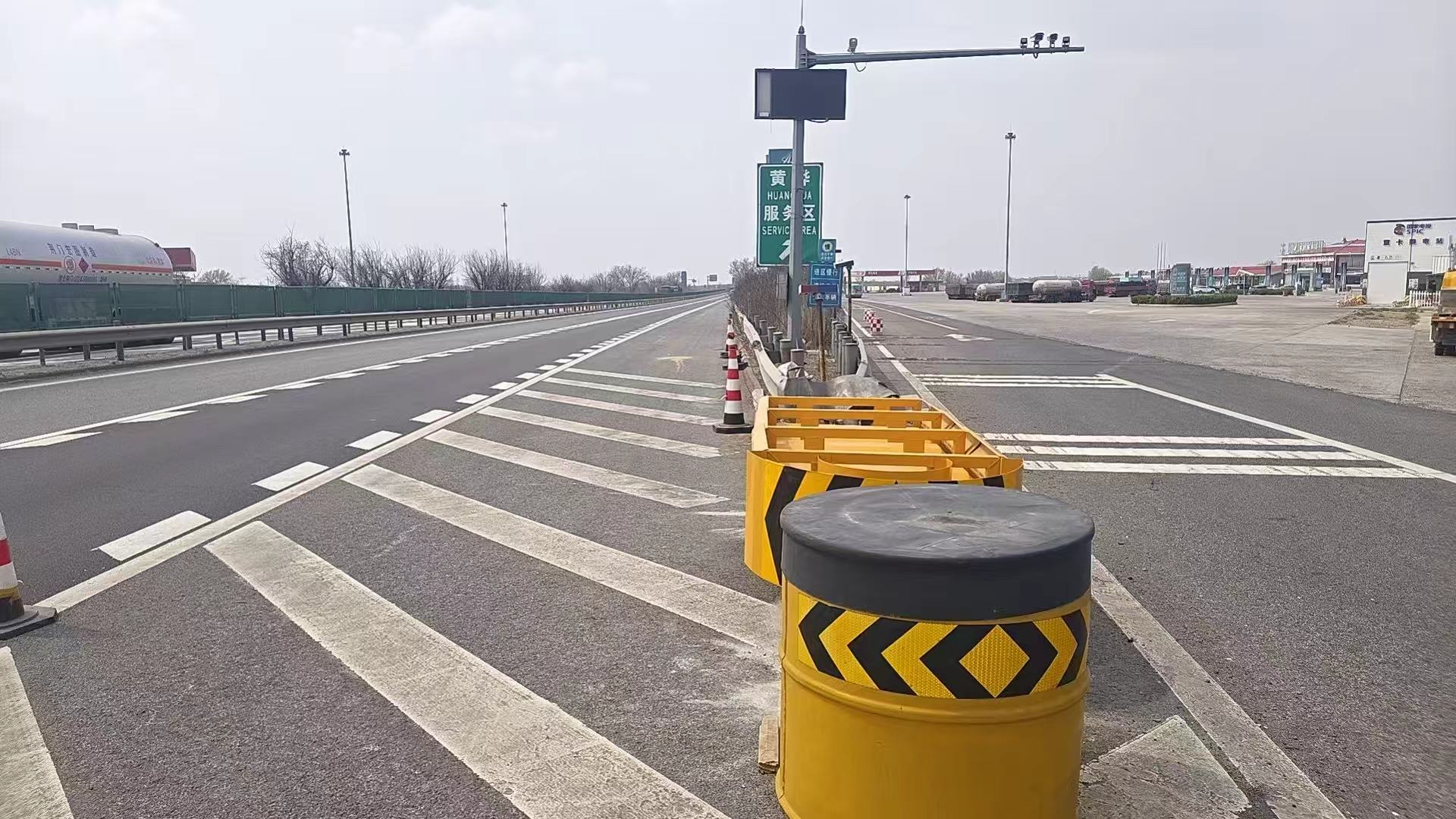 此次加装作业位于黄石高速石家庄方向黄骅东收费下道口及黄骅服务区入口两大重点区域。施工现场,养护队严格按照《公路养护安全作业规程》要求,提前规范布设安全警示标志、交通锥及导向标识,合理设置预警区域预警车辆、人员,在保障通行秩序与施工安全的前提下,精准开展加装作业。施工过程中,养护队严格把控质量关,确保防撞垫位置精准、固定牢固、反光标识清晰醒目。