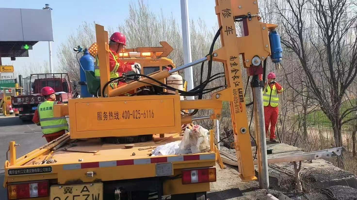 为消除道路安全隐患,保障过往司乘人员通行安全,2026年4月1日,上午9点,养护分公司沧州分中心衡水养护队组织人员、设备、材料,对献县西收费站外广场开展钢立柱更换、护栏板安装养护作业。