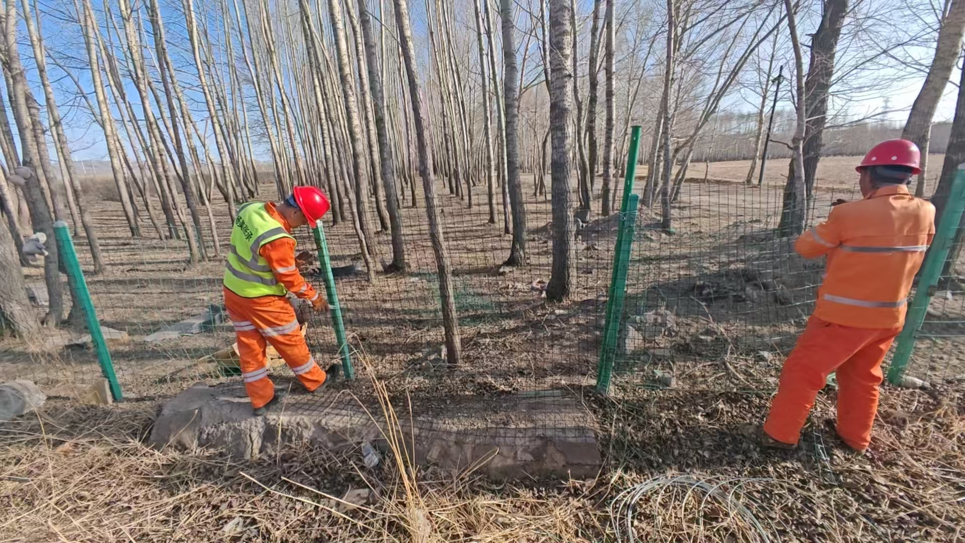 施工过程中,现场严格落实安全作业要求,规范摆放警示标志,提醒过往车辆和行人注意避让。队员分工协作、配合默契,对歪斜立柱进行扶正加固;对破损网片进行重新绑扎拼接;对锈蚀、断裂、缺失的刺丝进行更换、拉紧缠绕,做到安装整齐、牢固严实、标准统一,切实恢复隔离栅刺丝原有防护隔离功能。