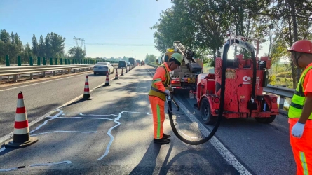 一是工程进度高效落实。分中心集中养护力量,克服天气等因素影响,高效完成了计划路段的裂缝灌封作业。本周累计完成路面灌封26000延米,有效封闭了路面裂缝,阻隔雨水下渗。[详细]